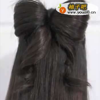 44将固定在头顶的那束头发向后用卡子固定在蝴蝶结中间。漂亮的蝴蝶结发型就完成了。如果不想要蝴蝶结下面的发束,将他们塞进大蝴蝶结里用小卡子固定就好。