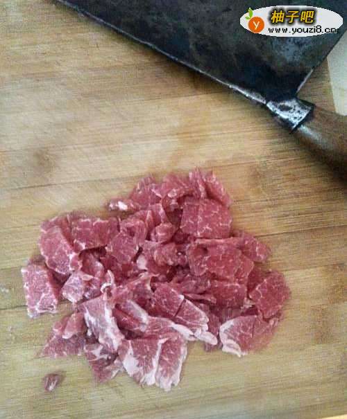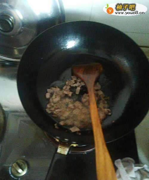 2待锅内的油温变高出现少量白烟,加入切好的肉片,大火翻炒,将肉片上的水分炒干(肉是从冰箱里拿出来的会有没化开的冰)。直到肉片抄的发白,有香味出来。