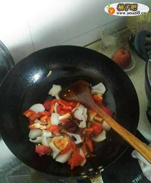 4放入青椒和圆葱,大火不停的翻炒至青椒表面微微卷曲,大概3分钟左右,加入酱油调色、调味,放入适量盐。