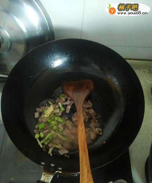 3肉片发白就炒的差不多了,放入切好的葱沫和姜沫翻炒。让蒜沫和姜沫的香味渗透到肉片中去。