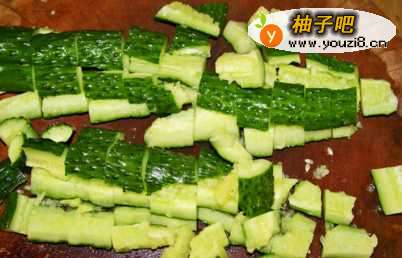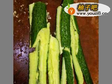 2拍脆瓜。把黄瓜洗干净后,不用削皮,只需要把瓜皮上的瓜钉用刀背轻轻刮走至光滑就可以了。然后在砧板上把刀放平,适当用力地把黄瓜拍裂开。也可以用保鲜纸包住黄瓜后,用木棍敲裂黄瓜。