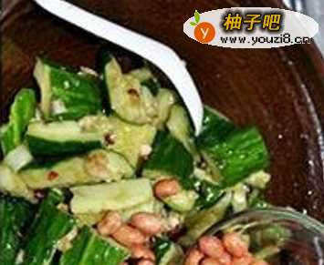 5落花生。把花生连皮在油中炸一会儿,只要花生皮出现一点干脆就可以捞起来。加入黄瓜中。