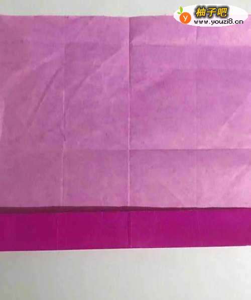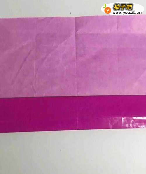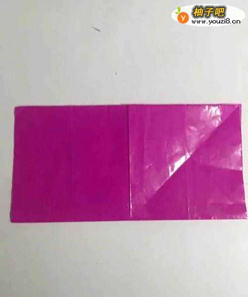 第一步 把一张16 厘米X16厘米的正方形二红色彩纸 从下向上折 取开再从左向右折 然后平放
