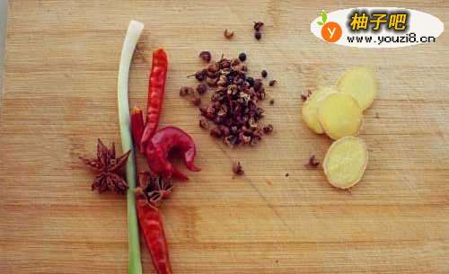 4准备好酱鹌鹑蛋需要的佐料:姜片,葱,大料,花椒和干红椒。