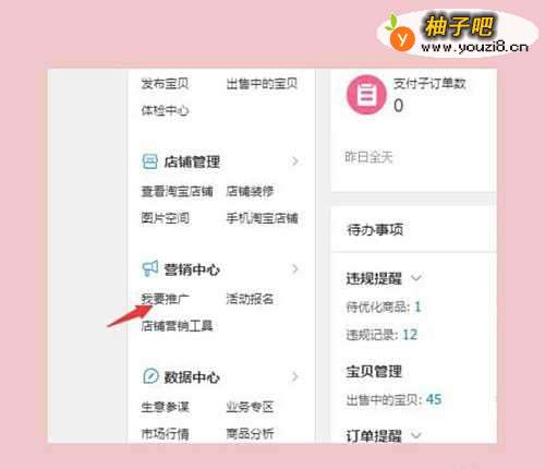 4在弹出的页面右侧选择“营销中心”-“我要推广”;