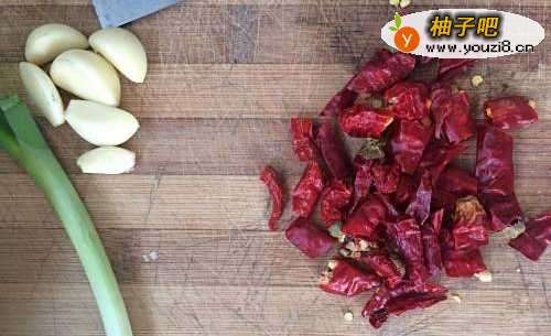2如图,取来干红椒、香葱、蒜瓣,洗净后切好备用。