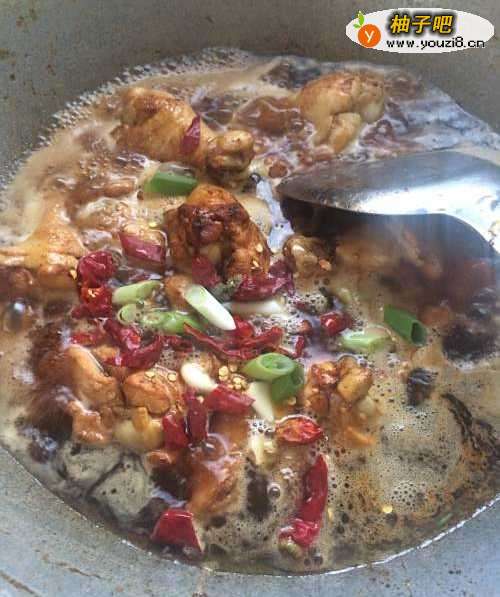 6如图,水开后放入香葱和干红椒,中火炖,熟透后放入蒜瓣和鸡精即可关火。