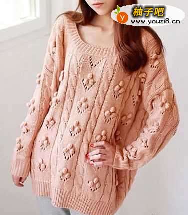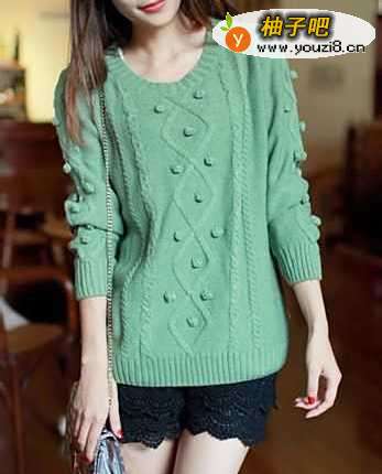 6圆领长袖麻花套头毛衣,板型上身会很休闲,宽松的款式,大大的圆领,可爱的小球球,甜美极了。