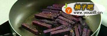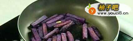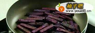 3第三步,把紫薯条放入锅里爆上5分钟左右。
