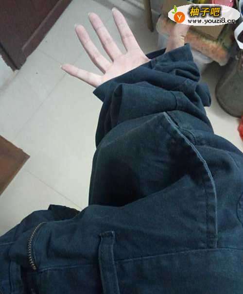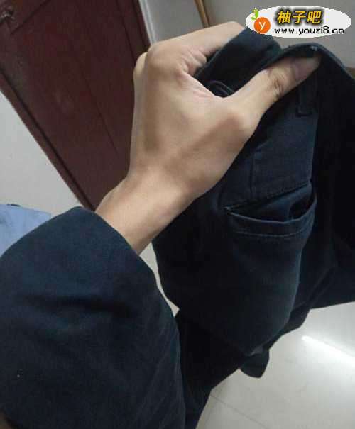 第一步:提着裤子,把左边裤脚挽到左小臂侧。