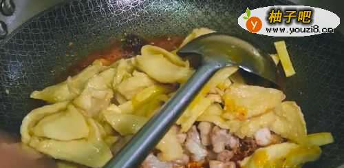 55、将焯好的千叶豆腐放入锅中翻炒匀均。然后放入半小勺盐、1小勺白糖、2小勺生抽、2小勺蚝油调味。