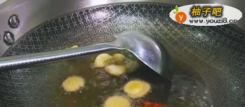 44、锅中倒入适量的油,油热后放入1勺豆瓣酱、1勺辣椒粉煸炒出红油。然后将红辣椒、葱姜蒜末放入锅中煸炒出香味。(火不要太大,太大容易将辣椒粉煸糊)