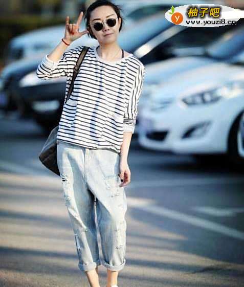 搭配七:宽松T恤T恤是我们春夏季穿搭中的必备单品,宽松T恤是很受欢迎,也非常显瘦的服饰,搭配一条破洞牛仔裤,时尚、大方又非常减龄。