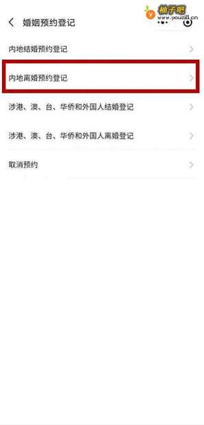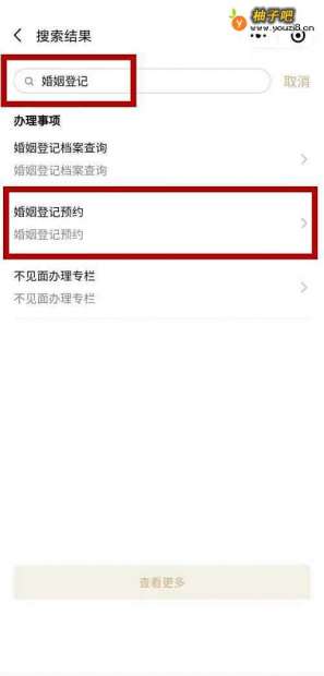 4输入结婚登记,点击进入结婚登记预约,如图红色文本框:
