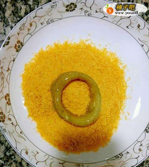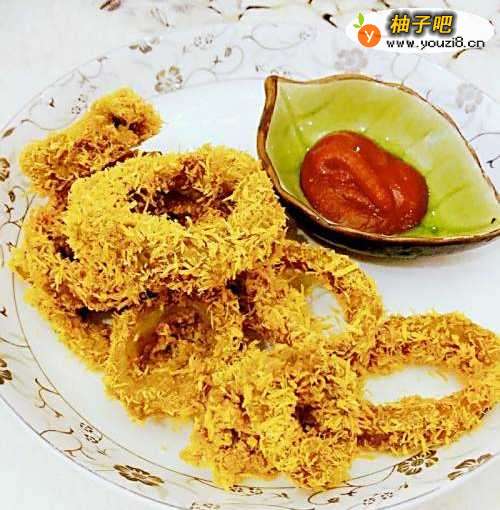 3将拌好的鱿鱼圈穿上一层面包糠外衣。