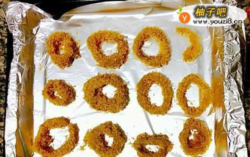 4将穿好衣服的鱿鱼圈依次放在烤盘中,烤箱220度预热后放入烤15分钟,两面金黄色即可。(温度根据自身烤箱调节,比如我的烤箱温度偏低,烤完15分钟后,不是很金黄色的样子,就又加了250度5分钟。)