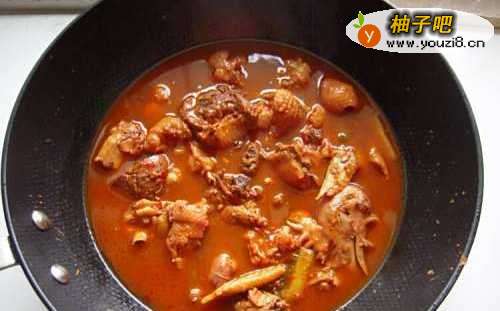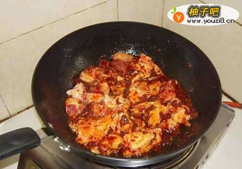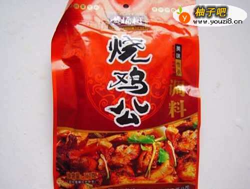 3炒锅放油,加入烧鸡公调料一袋。将调料爆出香味,鸡块放入锅中翻炒。