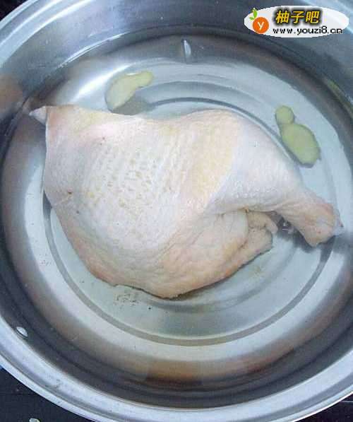 2锅中烧水,水沸后将鸡肉,姜片,料酒一同倒入锅中,焯一下水。