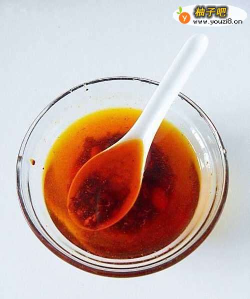 6另起廊秤泉锅烧热,放两大勺植物油,放入花椒、姜蒜、八角小火慢炸出香味。用滤网过滤,把热油倒入盛放辣椒面的碗中。