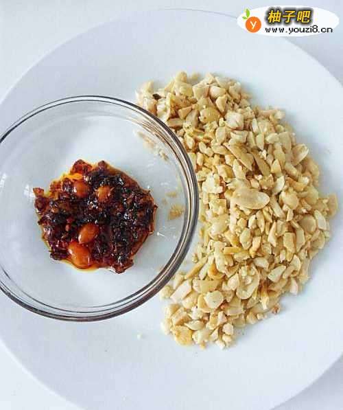5花生米碾成小颗粒状,碗内加入老干妈香辣酱1大勺备用。