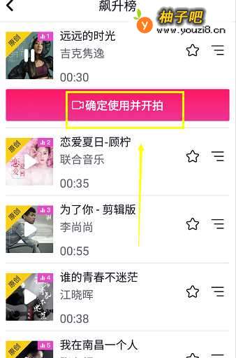 6选择你的音乐,点击确定使用并开拍,如下图所示