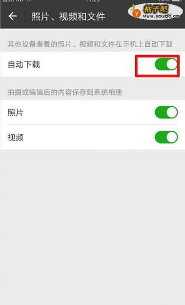 4再接处肤着在【照片、视频和文件】这一界面点击一下【自动下载】右侧的功能按钮,关闭这个功能。