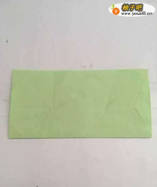 第一步 把一张16厘米X16厘米的正方形粉绿色彩纸 从下向上对边折叠