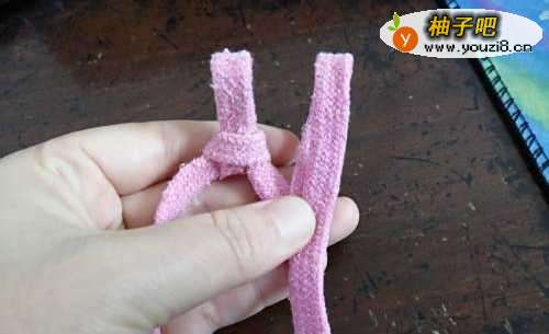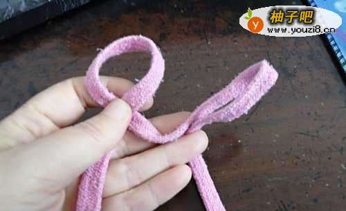 4然后把绳子拉紧,再把右边的绳挽一下,如下图的样子。