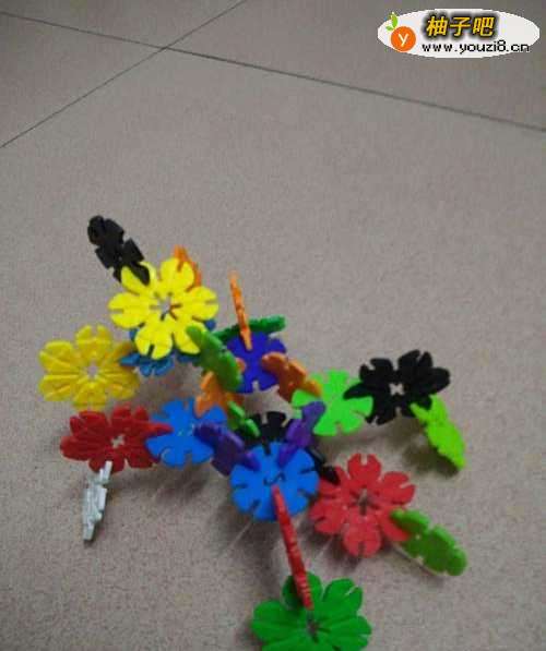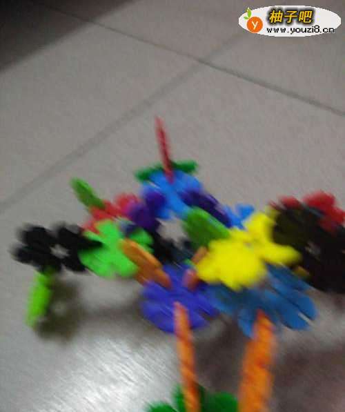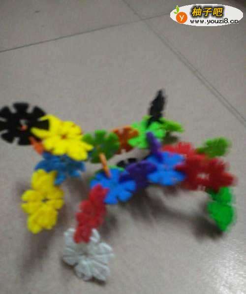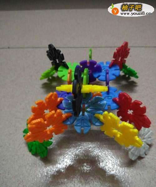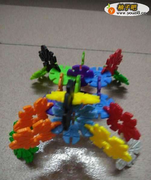 6再用两片雪花片拼接成蜘蛛的2个尾脚尾爪。瞧,一只拥有8条腿的可爱漂亮的蠢蠢欲动的蜘蛛就做成了。未满4岁宝宝的杰作哦。真不可思议呀。孩子的想象力真丰富。