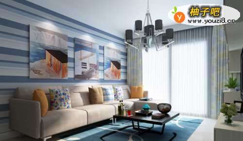 33、清润天蓝色的墙面故意刷成水迹斑斑,灰白色的地面与洁白的沙发显得格外清爽,沙发上淡黄、淡绿、淡青色的几个靠垫,为房间平添了几分活泼。东方特色的纸灯笼透出柔和的白色光雾在地面上投下串串倒影,使地面仿佛成了平静的水面。清翠的植物立在房间一角,飘散着阵阵幽香,整个居室的气氛像春雨拂过般清润不已。