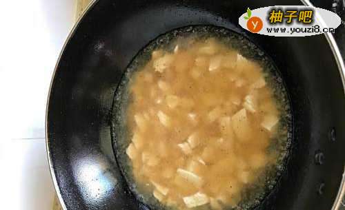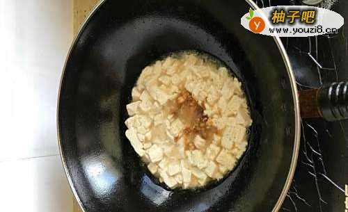 4在锅子里放入盐少许,姜丁,豆腐,并且稍微用铲子翻炒几下,但不要太用力,不然豆腐容易变的烂掉。大概一分钟后,加入生抽,增加鲜味。