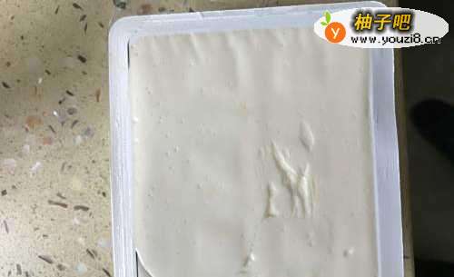 将买来的豆腐打开,用菜刀将豆腐进行分块,按照左右上下进行分,分成四方的豆腐块,注意刀要深入到盒子底部,如图所示。