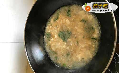 5然后在锅子里加入适量的清水,水量起码要漫过豆腐,如果是夏天,可以多加点水,多少出点汤。然后盖上锅盖,在小火慢煮1分钟即可。