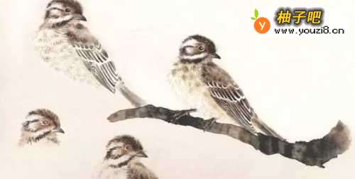 9.山雀画法步骤步骤一:用勾线笔勾出嘴、眼、头的形状,顺势用皴法画眼周围,注意不要画得太实、太闷,留些空隙,劈笔丝毛时顺着生长结构丝毛,颌羽、耳羽等处的墨色各有不同,干后可用淡赭拢一下,使其相融。步骤二:用狼毫笔蘸墨劈笔丝出背部,再以赭石渲染,以淡墨渐次画出翅膀的色彩层次,白色提翅边缘。步骤三:用赭黄色在胸腹部分打底,再以白色丝毛,并挑出飞白的羽毛。步骤四:用浓墨调赭石画鸟爪,注意要画得刚劲有力。用重墨挤出眼睛高光点来,进行调整和收拾。