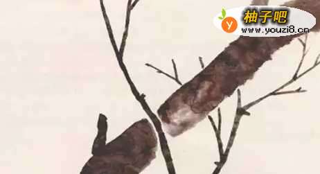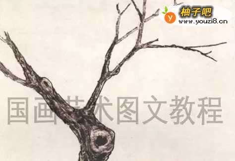 6勾皴法画枝干:借鉴山水画中树木的画法,用短锋的狼毫笔,挤掉一定的水分后散开锋。先从树的主干开始画起,中锋勾写,用渴墨勾出飞白的线条,勾勒时要做到胸有成竹,行笔要稳而有顿挫、提按,把握运笔的快慢节奏,随勾随皴,根据不同树木的皱裂纹用不山的皴法。切忌线条平滑、僵直。