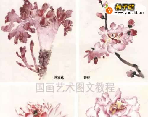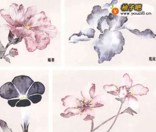 花冠画法单瓣花:常见的单瓣花如山茶、蜀葵、芙蓉、梅花、梨花、石榴、兰花等。在画之前,要对所画花的结构、形态、生长规律了如指掌,下笔才能合情合理。以蜀葵为例,蜀葵花冠为五瓣,花瓣纹路清晰,画时,事先把颜料调好,用中锋先蘸白色,再以笔尖取一点胭脂,一笔笔铺开,尽量做到一笔颜色一个花瓣,第二笔颜色衔接时要接着第一笔颜色走,逐渐过渡。趁未干时根据花瓣的形态结构,从外而内,用水笔将色冲开,任其自然渗化,在花瓣的基部点画深红和深紫色,并使色笔之间自然衔接,不要有明显的笔痕。干后用胭脂调墨勾出纹路。