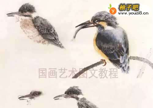 8翎毛画法翎毛即国画中的禽鸟,可分为水鸟与山鸟两大类。没骨花鸟一般多采用兼工带写的方法,从嘴画起,而后画眼睛、头、躯干、翅、尾、爪,当然这不是绝对的,要根据个人习惯而定。画鸟之前,必须对鸟的造型有深入的了解,这样画出来的鸟才有生命力。1.翠鸟画法步骤步骤一:先画鸟嘴、再勾画眼睛,眼圈不可勾的太圆,先是淡墨画轮廓,再用浓墨点睛,注意点睛要用新墨,不可用宿墨。步骤二:用花青稍调墨画出头部,用浓淡不同的墨色画出翅羽,劈笔丝毛,并略施花青罩色,待干时用石青加白色以写意手法点翠鸟肩部上的斑点。步骤三:以淡赭色用软毫笔点验胸部尾部,前深后渐虚。步骤四:用白粉对头部、颈部、腹部开始丝毛,注意剔出几根飞羽打破边缘线的平整。丝毛时宜分组进行,以“爪”字形相叠为好。画后,再画鱼和配景,进行统一调整和收拾。