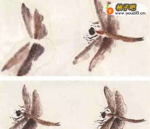 10草虫画法草虫个体小,形态、花纹、颜色多种多样,表现在画面上,就增添了几分情趣和生气,也能补救构图的不足,常见的草虫有蚱蜢、螳螂、天牛、蜜蜂、蝴蝶、飞蛾等。表现技法多样,有精工的勾填法,也有豪放的水墨法,亦有白描勾勒淡彩画法,可视画面整体布局选用不同的手法。蜻蜓画法示范