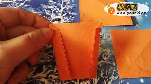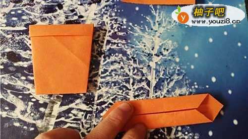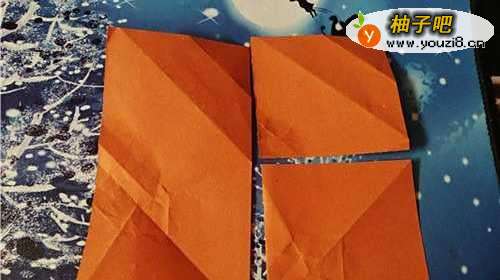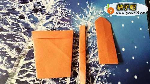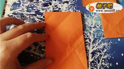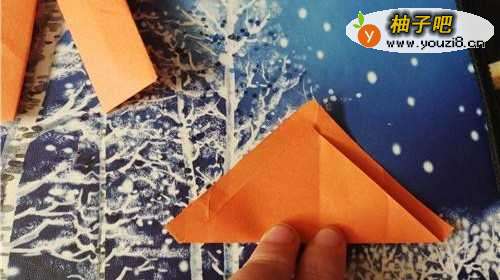 3然后,再把右侧的边向左折,翻到正面放到一边。我们再把小的彩纸两角对折,如图三。