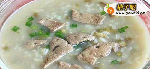 【制法】绿豆、大米淘净,加水适量,煮粥,快熟烂时,加入洗净、切碎的鲜猪肝,猪肝熟透即可食用。不宜加盐。