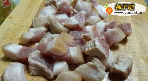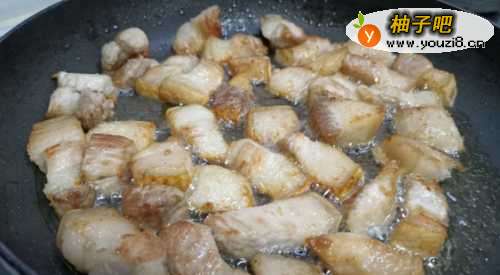 4这时候,往不粘锅下少量油,烧热,下五花肉煎至4面焦黄,然后捞出;