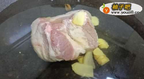 2接下来,在锅中加入冷水,放入五花肉,姜片,料酒煮出血水;