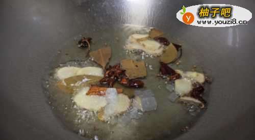 5另外起锅,下大料爆香,转小火下冰糖炒化;