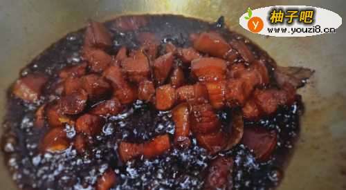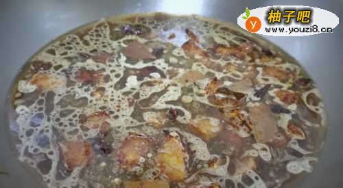 6放入五花肉小火翻炒,放入生抽、老抽翻炒均匀,倒入水大火煮开,然后小火熬制40分钟;