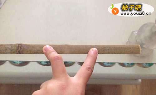 把两截竹条合并。底下对齐,上面留出10公分 参差的距离