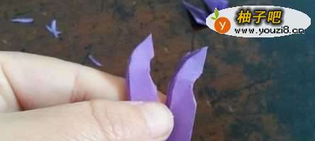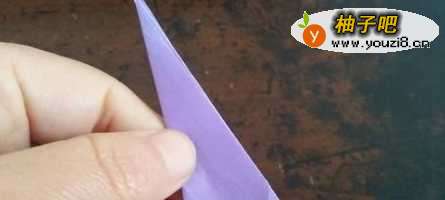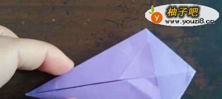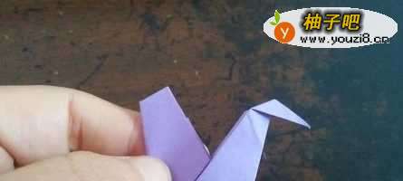 3再把右侧的角斜着向上折,打开后,把边向上折。我们把右角向下折一下,孔雀的头部就折好了。