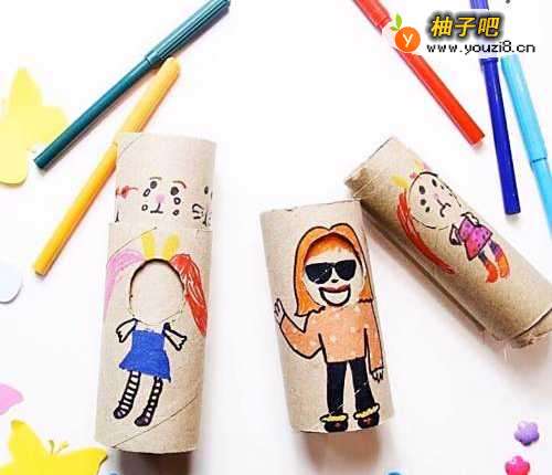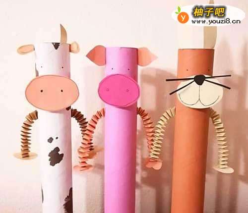 用卷纸筒做动物或者人体的身子,贴上五官和四肢,这种简单易行,不需要花费太多时间。
