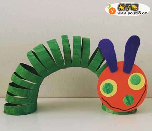 5好饿的毛毛虫,把卷纸筒中间剪开,不要剪断,贴上宝宝画的毛毛虫头,旁边还可以放几个水果。