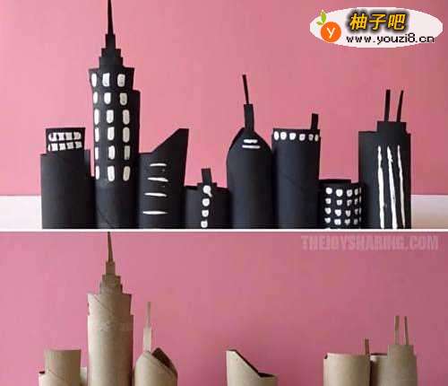 2用纸筒制作3D城市模型,几个纸筒裁剪好摆在一起,上色,绝对是幼儿园里面最炫酷的卷纸筒作品。
