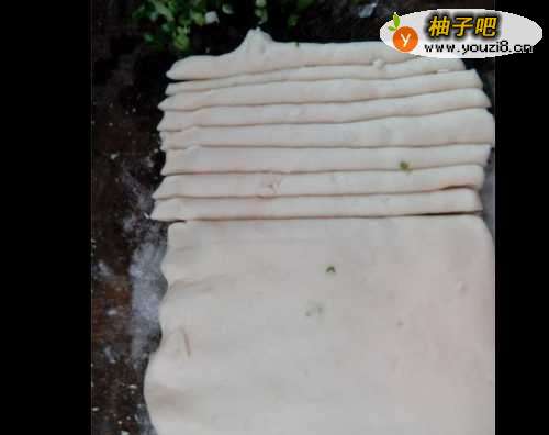 4取出发酵好的面团,揉开,揉走面团里的空气,用菜刀切成细条状;